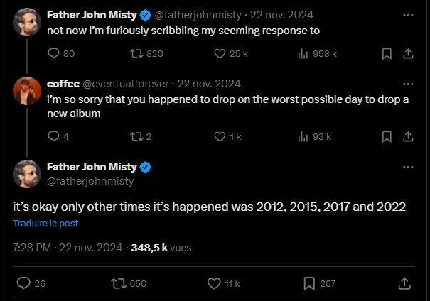 Oui, c’est bien arrivé. C’est donc la cinquième fois qu’une sortie d’album de Father John Misty se fait saborder par Kendrick Lamar. Une coïncidence dont le principal intéressé avait l’air au courant au vu de sa réponse. Twitter devient hilare et plein de compassion envers le musicien. Certains remixent les musiques des deux artistes pour en faire un album commun. Certains découvrent avec plaisir la musique du crooner grâce à cette affaire.